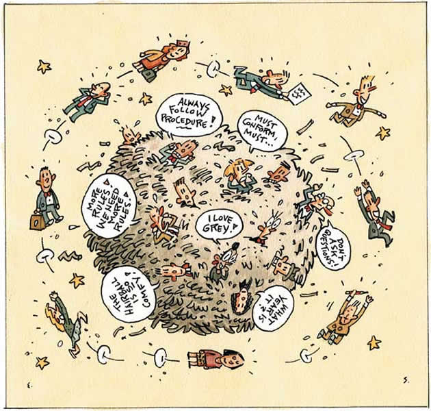 A leader’s world is not black and white. If an organization is to choose vigor over an ultimate state of uniformity…it must honor and support both the rational exploration of success and the non-rational art of creating. In the book Orbiting the Giant Hairball: A Corporate Fool’s Guide to Surviving with Grace by Gordon MacKenzie, he developed an office simply called The Creative to accomplish all the above.
