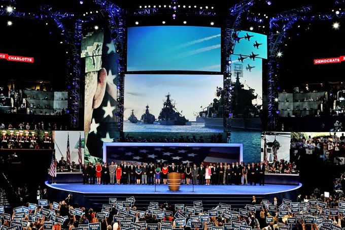 On the last night of the Democratic National Convention, a retired Navy four-star took the stage to pay tribute to veterans. Behind him, on a giant screen, the image of four hulking warships reinforced his patriotic message.