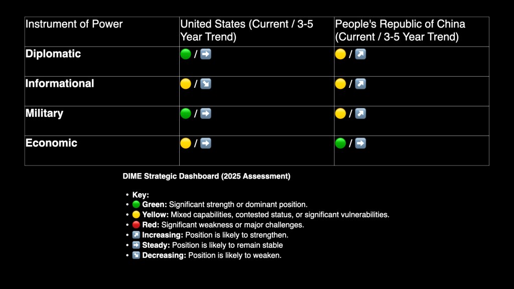 Characterizing this rivalry requires more than a catalog of weapons or economic statistics. National power is multidimensional, interdependent, and constantly evolving. For years, strategic practitioners across government have used the DIME framework—Diplomatic, Informational, Military, Economic—to organize and assess these dimensions. Although imperfect and prone to misuse when treated as a checklist, DIME becomes a powerful analytical tool when understood as a system of interconnected levers. Through this systemic interpretation, the U.S.–China competition emerges not as a static contest but as an integrated struggle shaped by alignment, adaptation, and strategic purpose.